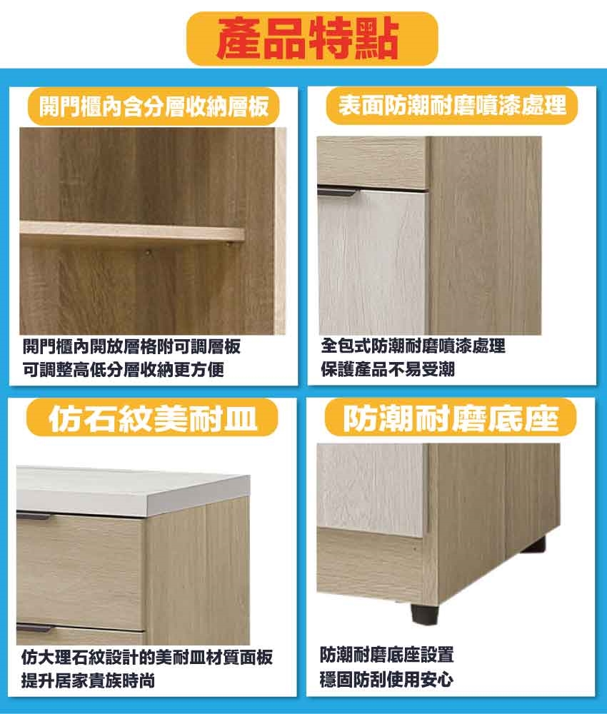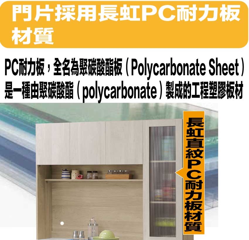 材質:防蛀木心板+防潮耐磨底座+五金滑軌結構+5mm長虹直紋PC耐力板+仿大理石紋耐磨美耐皿材質桌面板+防夾手緩衝門片五金