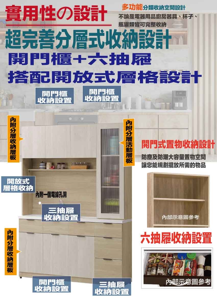 搭配採用開門櫃+六抽屜+內&外開放層格等收納空間設計