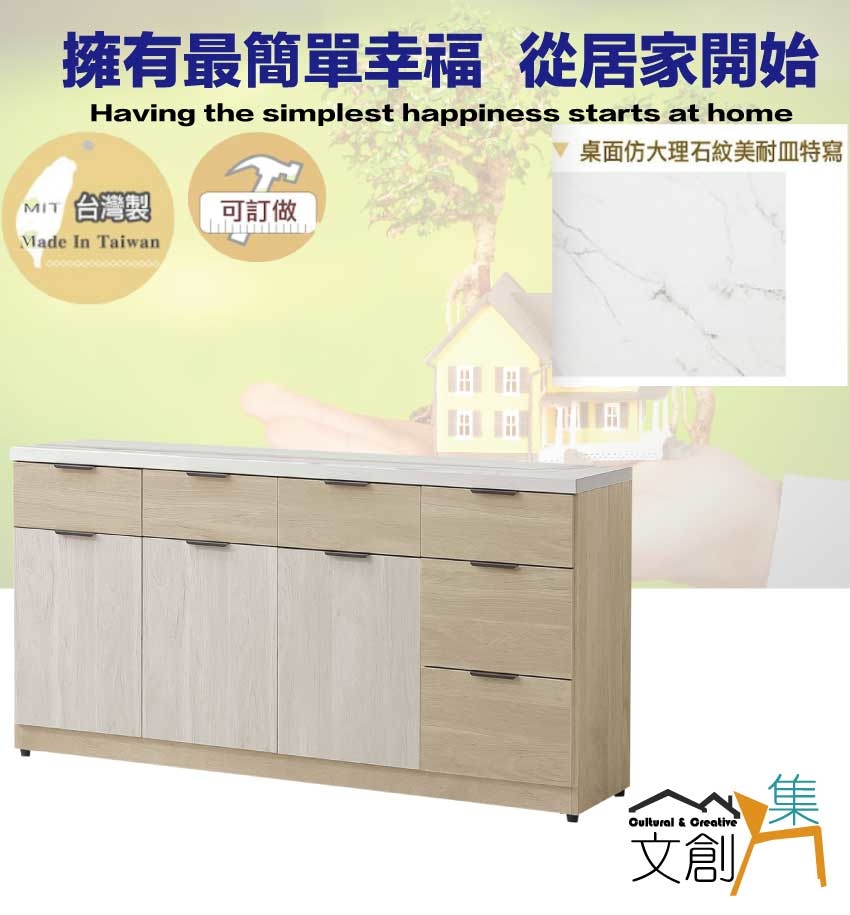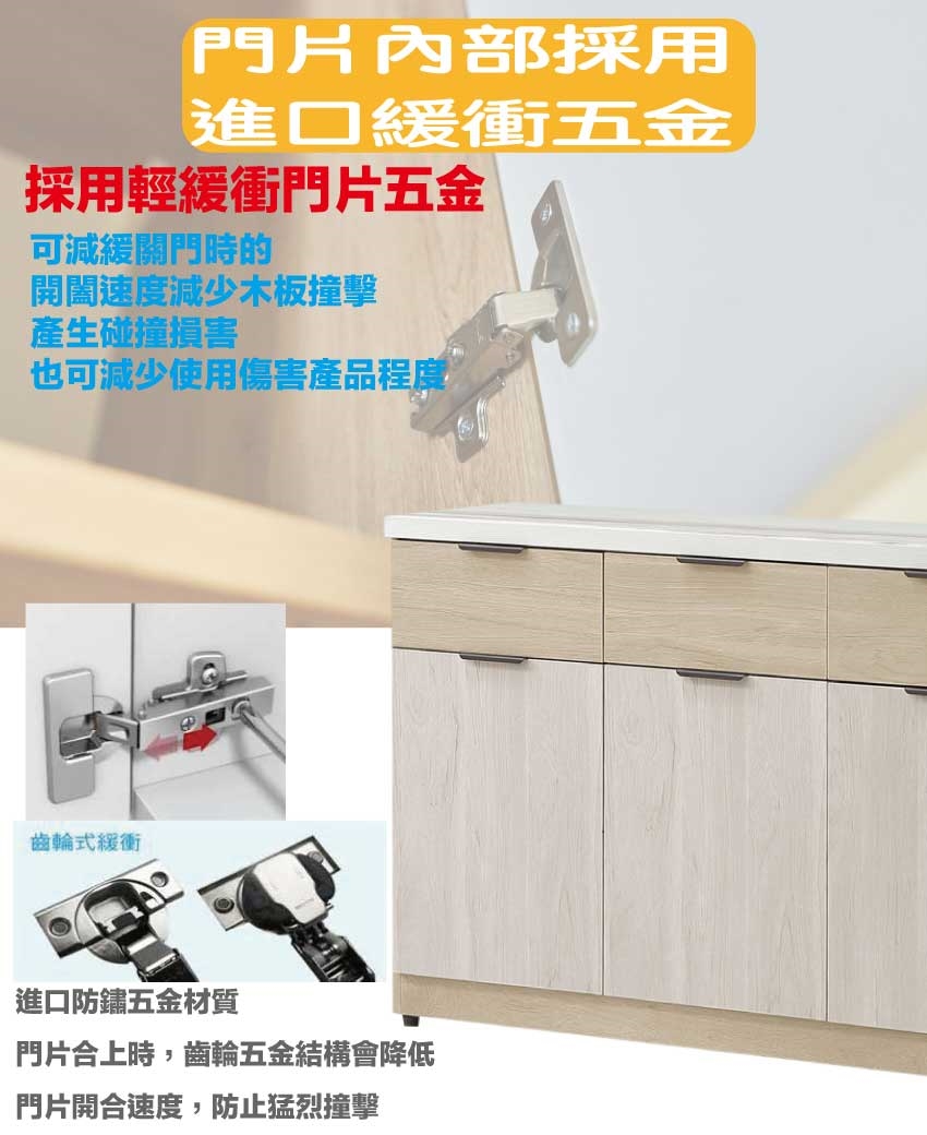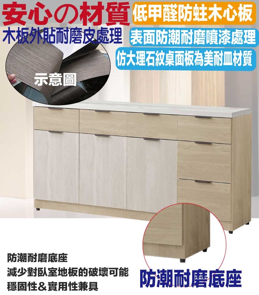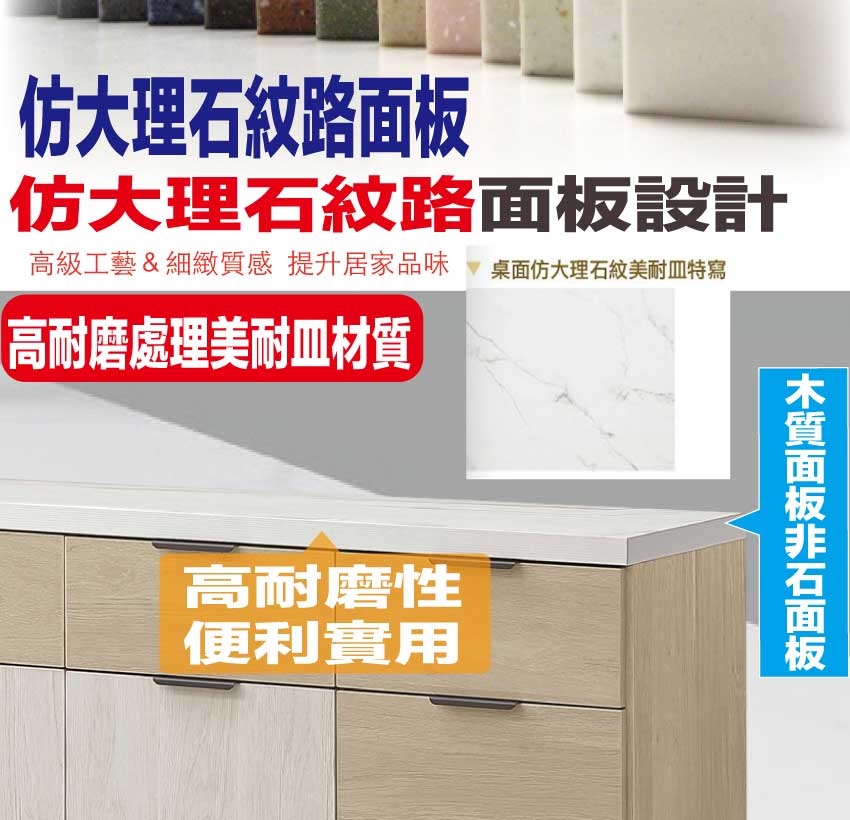 材質:防蛀木心板+防潮耐磨底座+五金滑軌結構+仿大理石紋耐磨美耐皿材質桌面板+防夾手緩衝門片五金