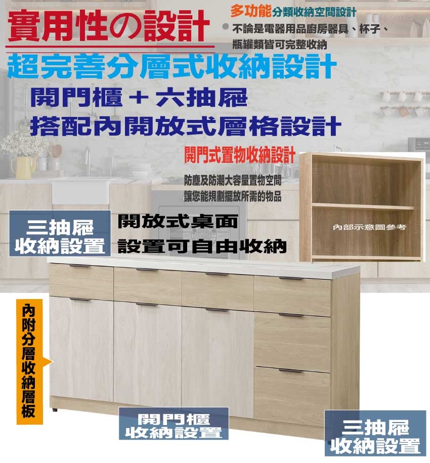 搭配採用開門櫃+六抽屜+內開放層格等收納空間設計