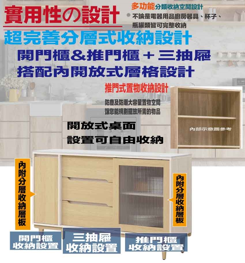 搭配採用推門櫃+開門櫃+三抽屜+內開放層格等收納空間設計