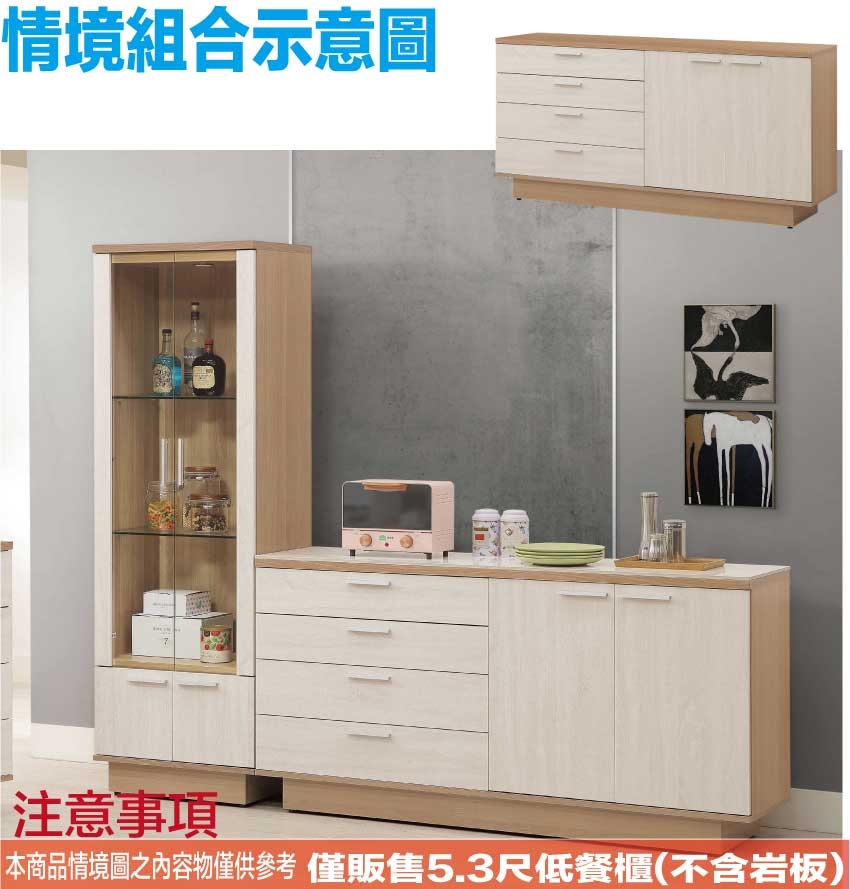 ★偏遠地區需額外加收運費,下標請先問與答詢問★ ★下訂前注意 由於商品流動較快,下訂前請先詢問是否有貨在下訂喔~★ 【綠家居】賓利雙色5.3尺二門四抽餐櫃 木紋雙色系+安心材質製造,使用放心+搭配居家更便利,採用防蛀木心板+防刮耐磨底座+防夾手緩衝門片五金等安心材質製造 ,外層採用防潮耐磨噴漆處理搭配採用開門櫃+四抽屜+內收納層格等收納空間設計,全由專人配送到家,專業安心服務,替你省下更多時間!