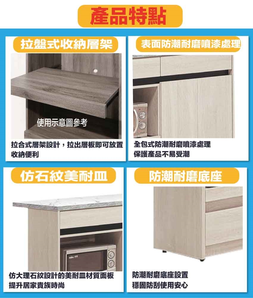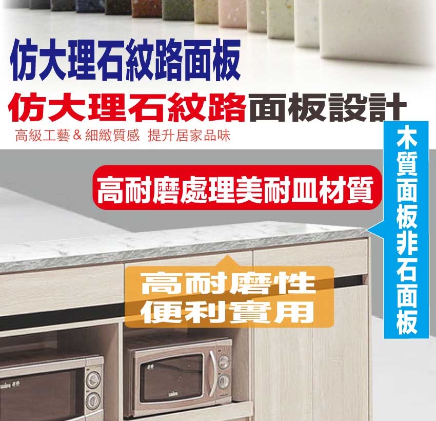 材質:防蛀木心板+防潮耐磨底座+防夾手緩衝五金+五金滑軌結構+耐磨美耐皿仿大理石紋桌面板