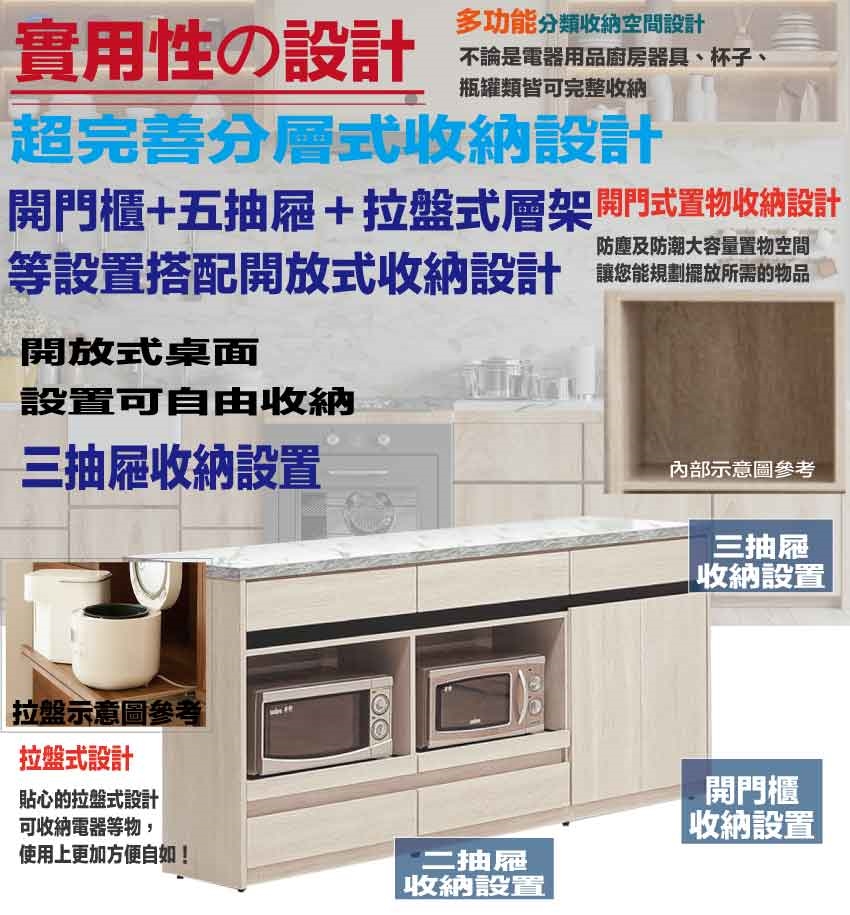 採用開門櫃+拉盤層架+五抽屜+內&外開放層格等收納空間設計