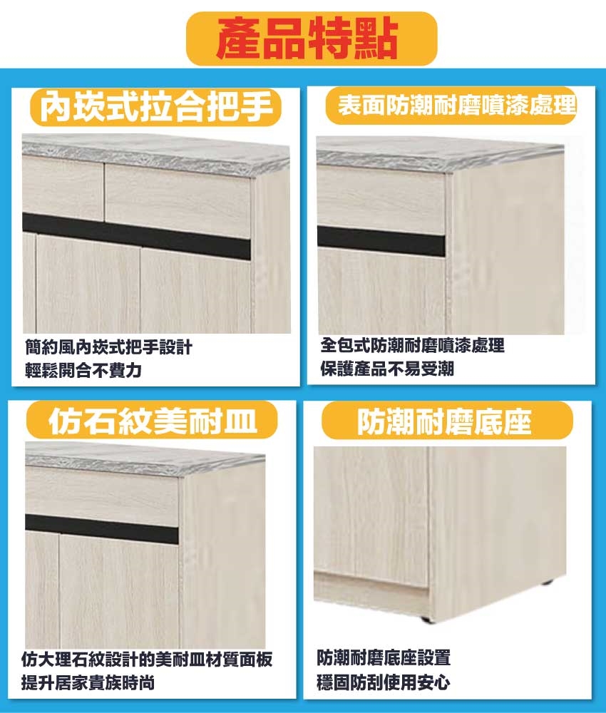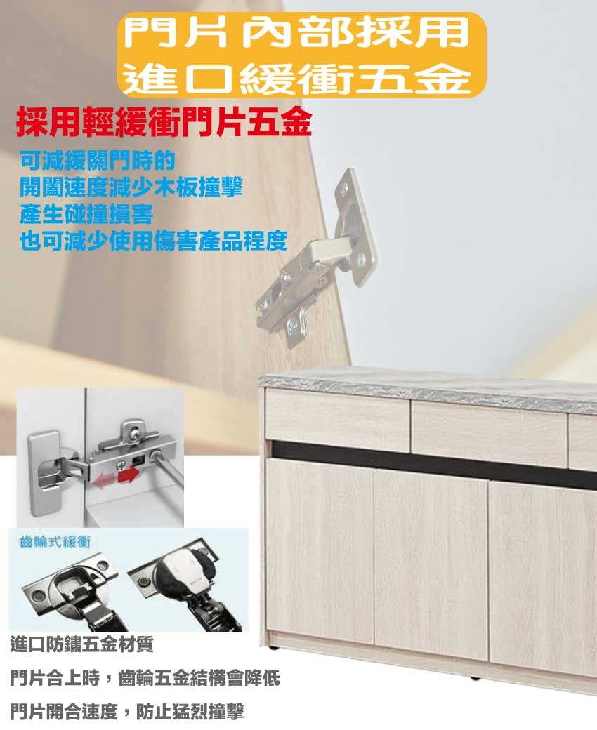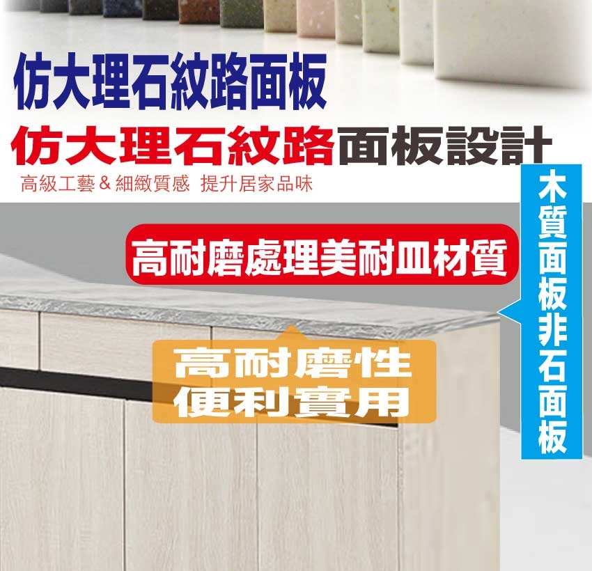 材質:防蛀木心板+防潮耐磨底座+防夾手緩衝五金+五金滑軌結構+耐磨美耐皿仿大理石紋桌面板