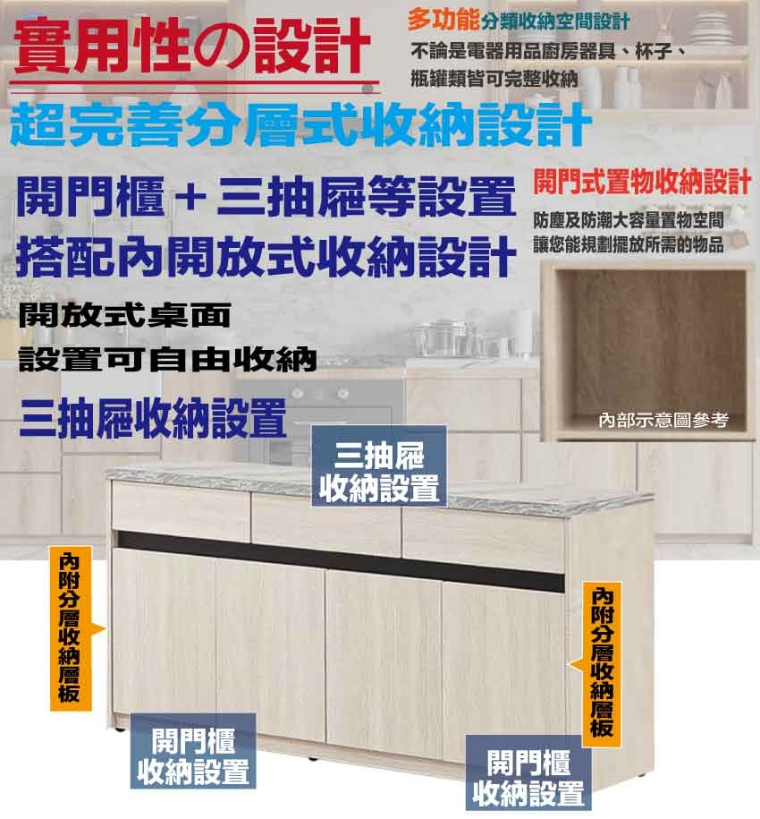 採用開門櫃+三抽屜+內開放層格等收納空間設計