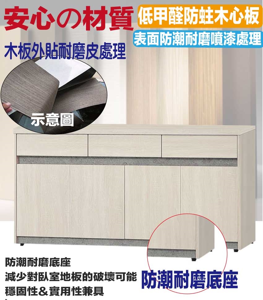 防蛀木心板+防潮耐磨腳座+防夾手緩衝五金+五金滑軌結構等材質製造