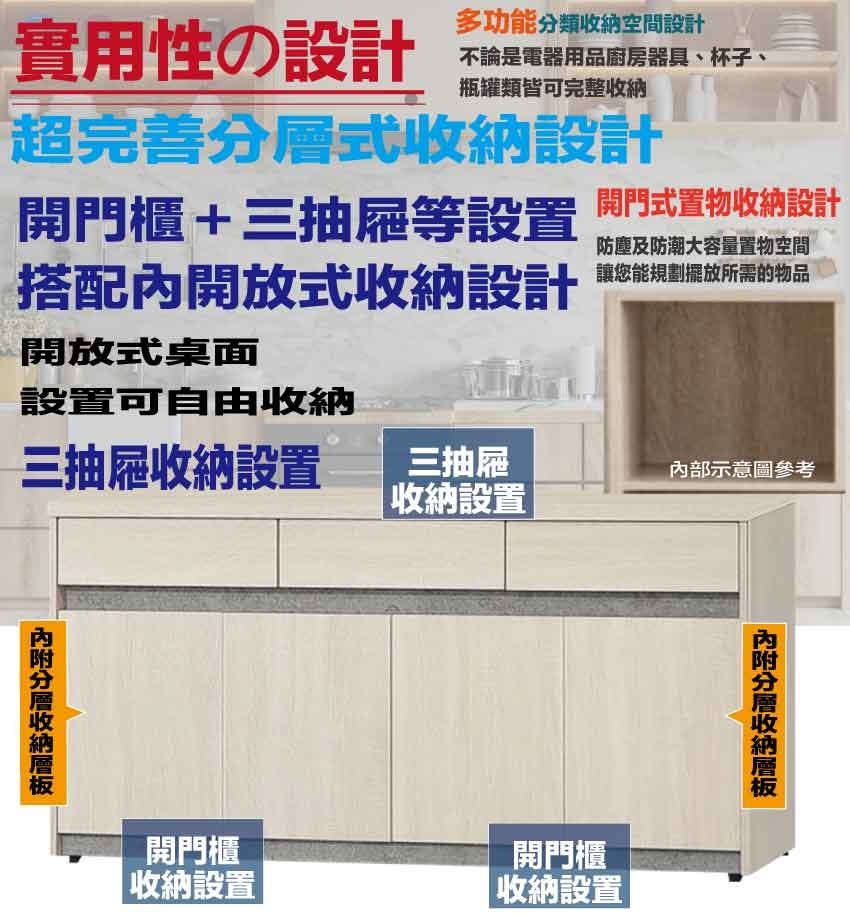 採用開門櫃+三抽屜+內開放層格等收納空間設計