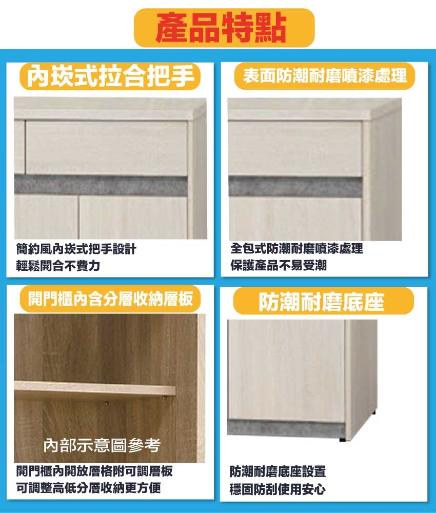 材質:防蛀木心板+防潮耐磨底座+防夾手緩衝五金+五金滑軌結構