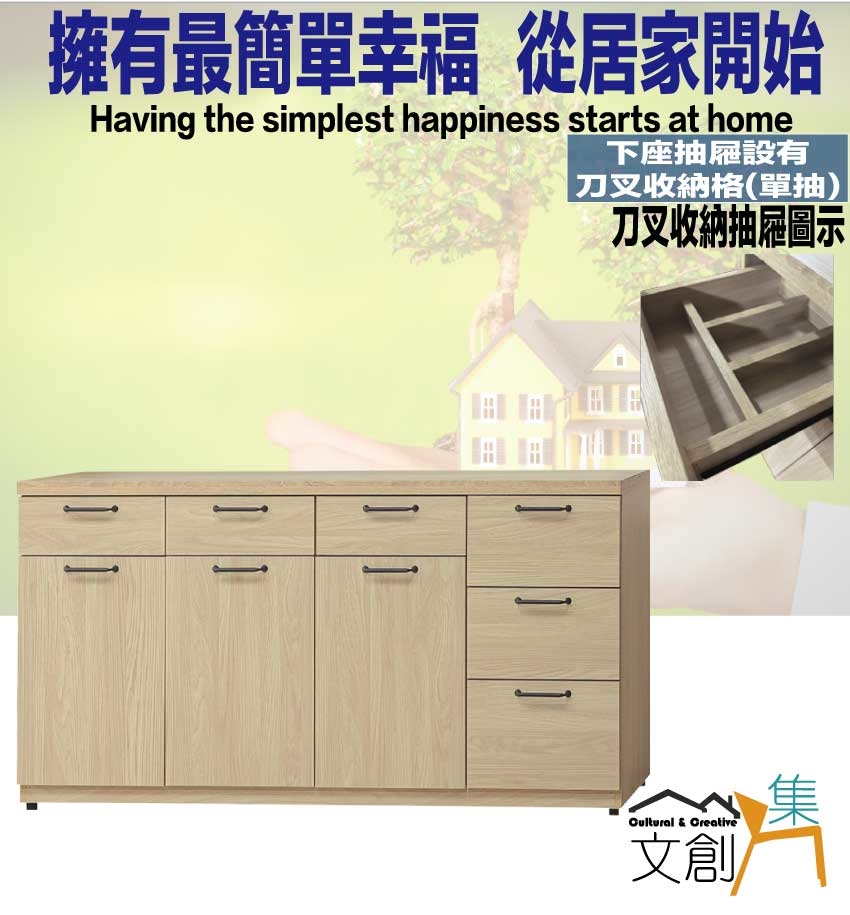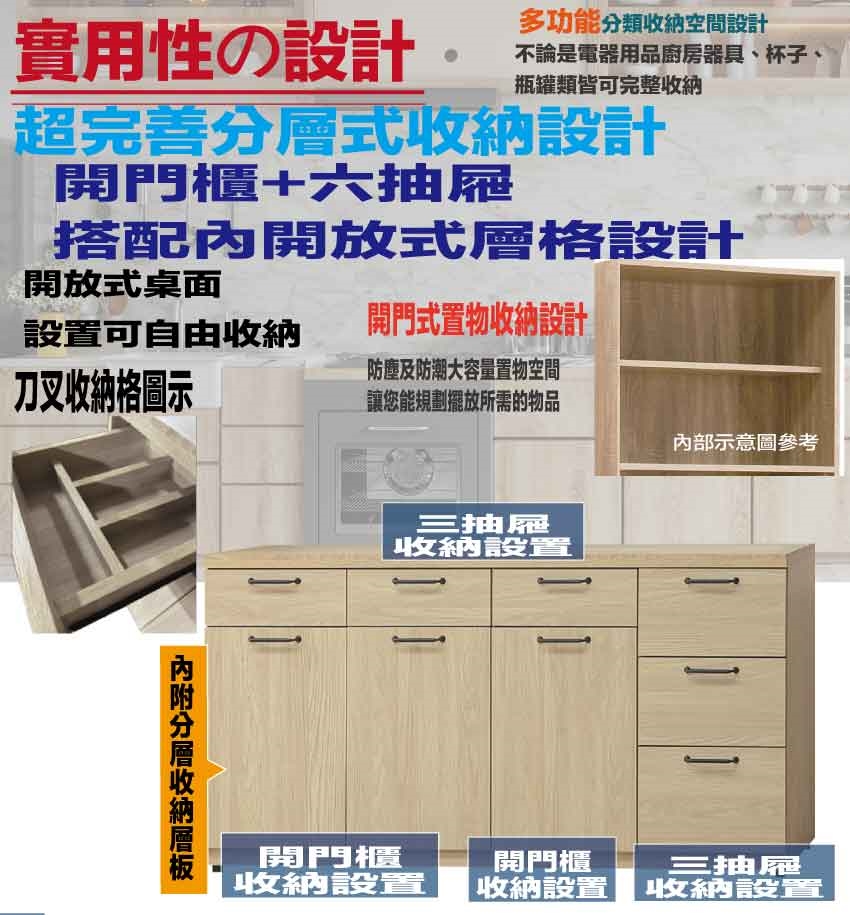 採用開門櫃+六抽屜(內含刀叉收納抽屜)+內開放層格等收納空間設計