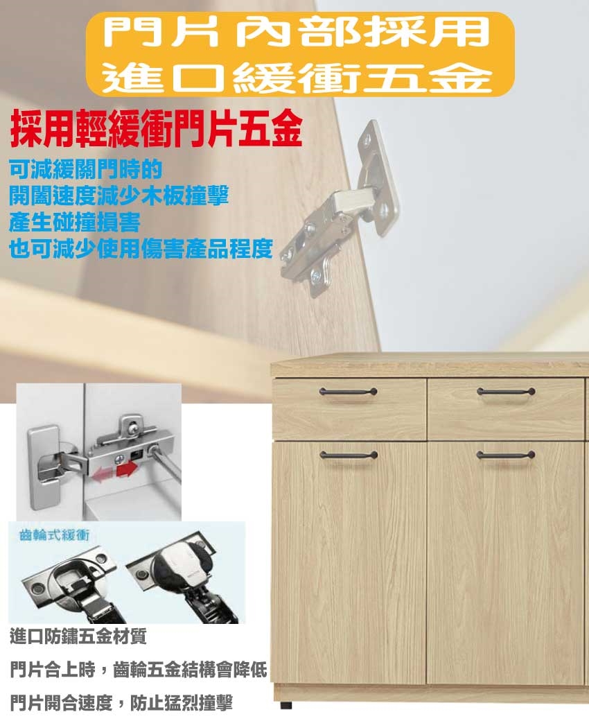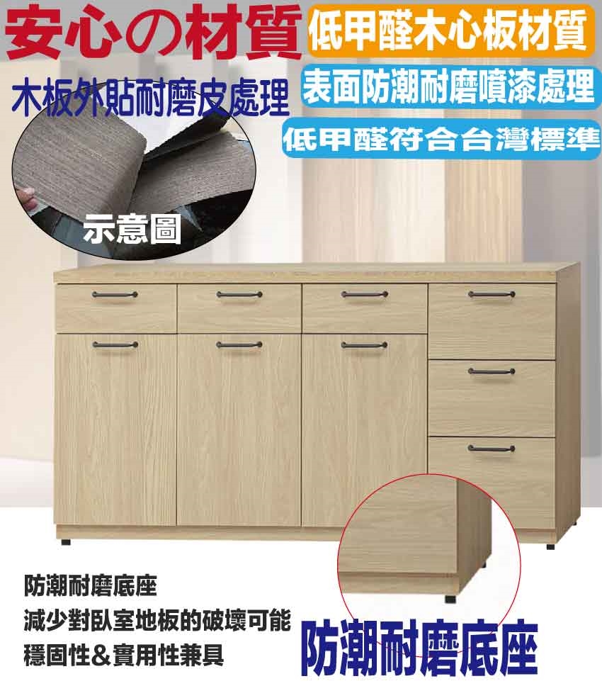 材質:防蛀木心板+防潮耐磨底座(可調高低水平)+防夾手緩衝門片五金