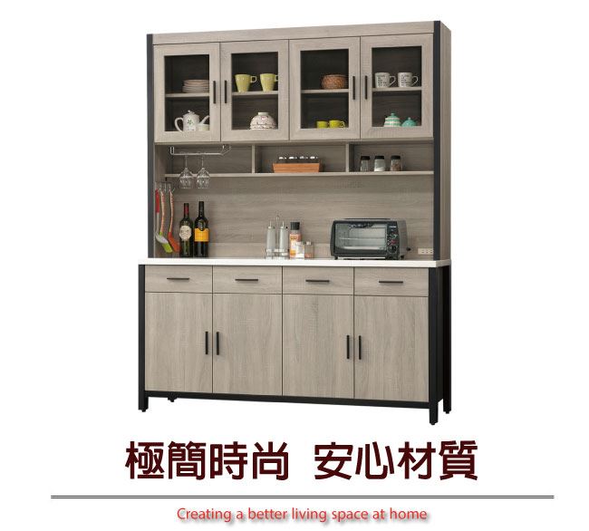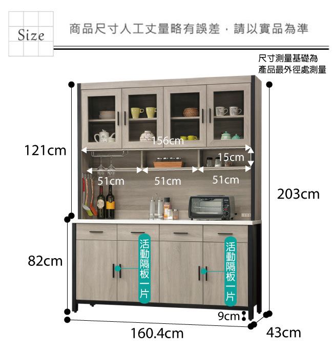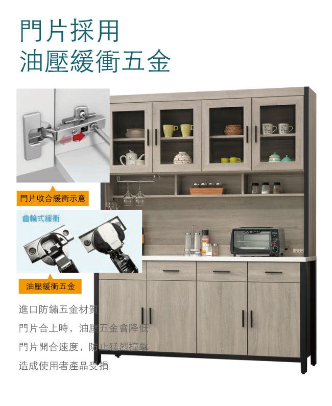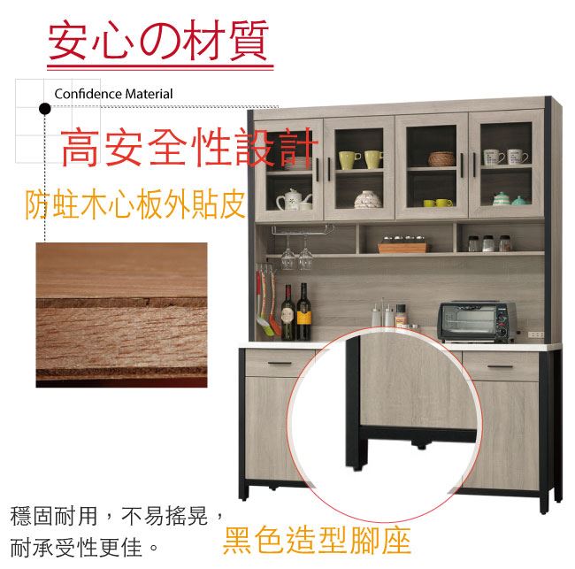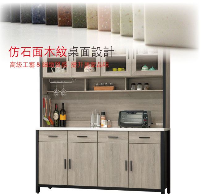 材質 | ◆產品名稱:【綠家居】 科托 時尚5.3尺八門四抽餐櫃/收納櫃組合 尺寸:(寬)160.4x(深)43x(高)203公分 ◆材質: 材質:防蛀木心板外貼皮+五金滑軌結構+黑色造型腳座+防夾手緩衝門片五金+仿雲紋石紋路木質桌面板 |