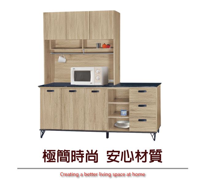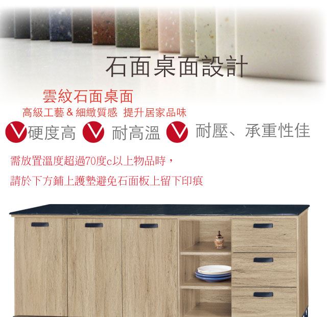 商品介紹 | 【綠家居】哈爾 橡木紋6尺三抽雲紋石面餐櫃組合 橡木紋色系+現代簡約風格+安心材質製造,整體採用防蛀木心板+黑鐵砂腳座+五金滑軌結構+12mm雲紋石面板+防夾手緩衝門片五金等安心材質製造,產品外層採用防潮耐磨噴漆處理搭配採用開門櫃+三抽屜+開放式收納等收納空間設計,全由專人配送到家,專業安心服務,替你省下更多時間! 【商品特色】 橡木紋色系+現代簡約風格+安心材質製造,使用放心+搭配居家更便利 採用防蛀木心板+黑鐵砂腳座+五金滑軌結構+12mm雲紋石面板+防夾手緩衝門片五金等安心材質製造 產品外層採用防潮耐磨噴漆處理 搭配採用開門櫃+三抽屜+開放式收納等收納空間設計 此商品不需要DIY組立,此商品為組立後之成品 品質保證、專業設計、貼心服務 全由專人配送到家,專業安心服務,替您省下更多時間 |