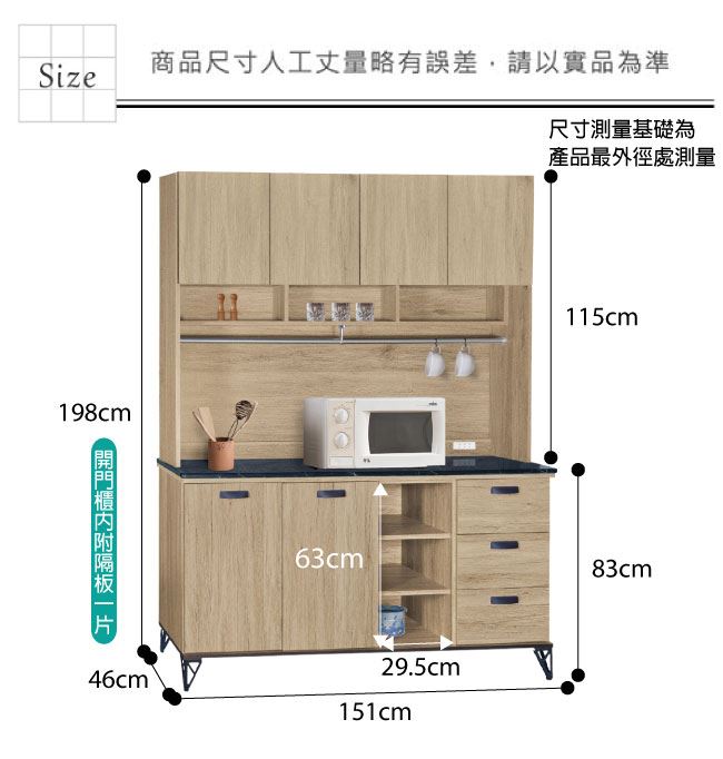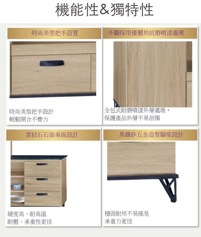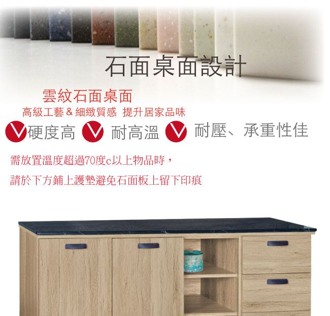 商品介紹 | 【綠家居】哈爾 橡木紋5尺三抽雲紋石面餐櫃組合 橡木紋色系+現代簡約風格+安心材質製造,整體採用防蛀木心板+黑鐵砂腳座+五金滑軌結構+12mm雲紋石面板+防夾手緩衝門片五金等安心材質製造,產品外層採用防潮耐磨噴漆處理搭配採用開門櫃+三抽屜+開放式收納等收納空間設計,全由專人配送到家,專業安心服務,替你省下更多時間! 【商品特色】 橡木紋色系+現代簡約風格+安心材質製造,使用放心+搭配居家更便利 採用防蛀木心板+黑鐵砂腳座+五金滑軌結構+12mm雲紋石面板+防夾手緩衝門片五金等安心材質製造 產品外層採用防潮耐磨噴漆處理 搭配採用開門櫃+三抽屜+開放式收納等收納空間設計 此商品不需要DIY組立,此商品為組立後之成品 品質保證、專業設計、貼心服務 全由專人配送到家,專業安心服務,替您省下更多時間 |