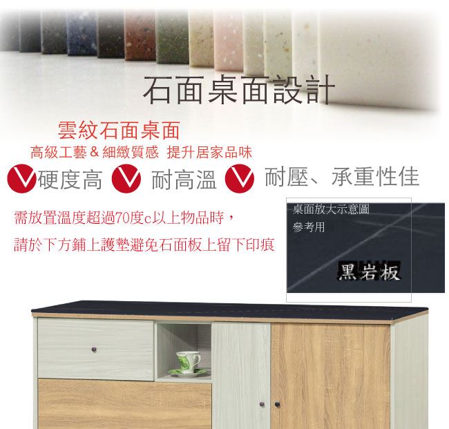 商品介紹 | 【綠家居】貝斯安 六門5尺黑岩板石面餐櫃組合(二色可選) 二色可選+現代簡約風格+安心材質製造,整體採用防蛀木心板+黑鐵砂腳座+五金滑軌結構+12mm黑岩板石面板+防夾手緩衝門片五金等安心材質製造,產品外層採用防潮耐磨噴漆處理搭配採用開門櫃+二抽屜+開放式收納等收納空間設計,全由專人配送到家,專業安心服務,替你省下更多時間! 【商品特色】 二色可選+現代簡約風格+安心材質製造,使用放心+搭配居家更便利 採用防蛀木心板+黑鐵砂腳座+五金滑軌結構+12mm黑岩板石面板+防夾手緩衝門片五金等安心材質製造 產品外層採用防潮耐磨噴漆處理 搭配採用開門櫃+二抽屜+開放式收納等收納空間設計 此商品不需要DIY組立,此商品為組立後之成品 品質保證、專業設計、貼心服務 全由專人配送到家,專業安心服務,替您省下更多時間 |