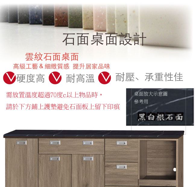 商品介紹 | 【綠家居】安貝斯 灰橡6尺黑白雲紋石面餐櫃組合 灰橡木紋色系+現代簡約風格+安心材質製造,整體採用防蛀木心板+黑鐵砂腳座+五金滑軌結構+12mm黑白雲紋石面板+防夾手緩衝門片五金等安心材質製造,產品外層採用防潮耐磨噴漆處理搭配採用開門櫃+五抽屜+拉合式層架+開放式收納等收納空間設計,全由專人配送到家,專業安心服務,替你省下更多時間! 【商品特色】 灰橡木紋色系+現代簡約風格+安心材質製造,使用放心+搭配居家更便利 採用防蛀木心板+黑鐵砂腳座+五金滑軌結構+12mm黑白雲紋石面板+防夾手緩衝門片五金等安心材質製造 產品外層採用防潮耐磨噴漆處理 搭配採用開門櫃+五抽屜+拉合式層架+開放式收納等收納空間設計 此商品不需要DIY組立,此商品為組立後之成品 品質保證、專業設計、貼心服務 全由專人配送到家,專業安心服務,替您省下更多時間 |
