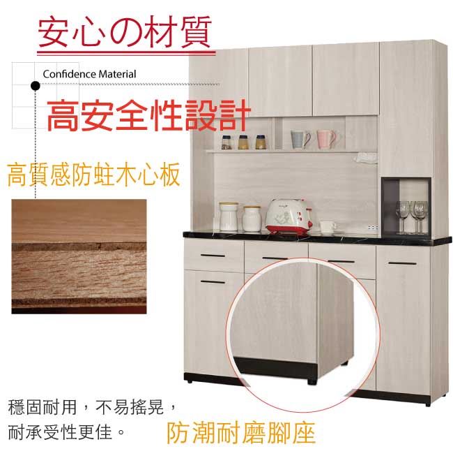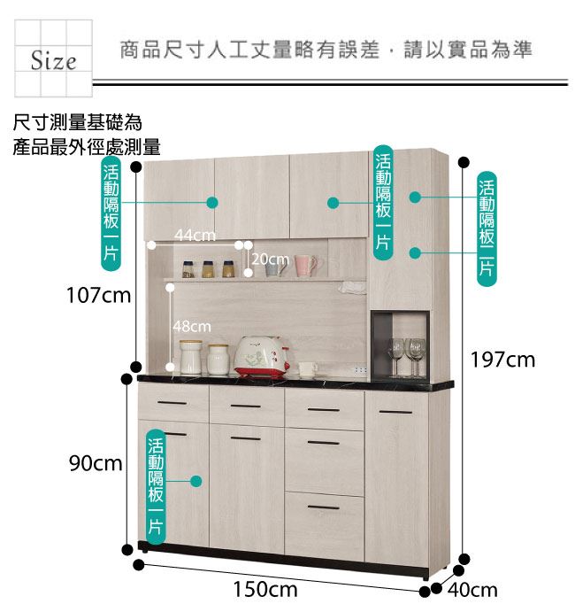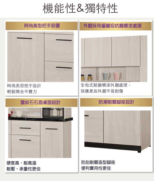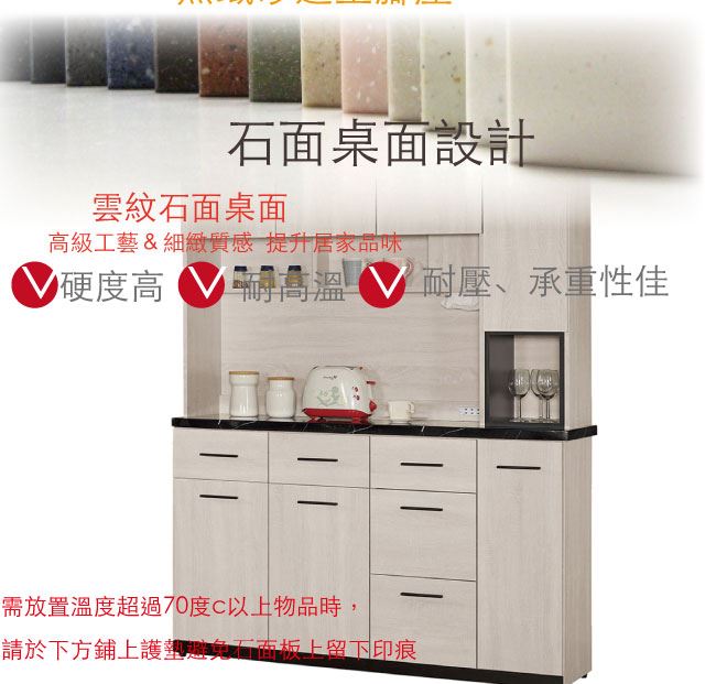 材質 | ◆產品名稱: 【綠家居】艾藍 時尚5尺雲紋石面餐櫃/收納櫃組合 尺寸:(寬)150x(深)40x(高)197/公分 ◆材質: 材質:防蛀木心板+防潮耐磨腳座+防夾手緩衝門片五金+五金滑軌結構+8mm雲紋石面桌面板 噴漆:防潮耐磨噴漆處理