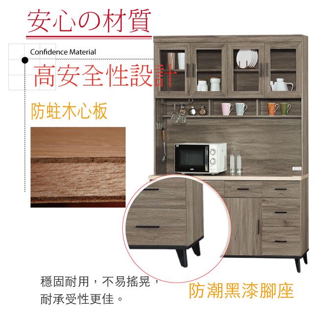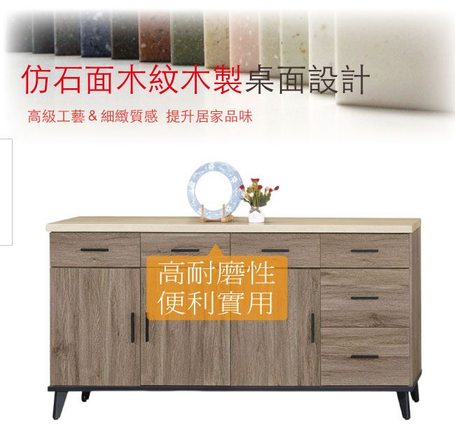 材質 | ◆產品名稱:【綠家居】米丘灰橡5.3尺七門六抽高餐櫃/收納櫃組合 尺寸:(寬)160.4x(深)43(高)202.2/公分 ◆材質: 材質:防蛀木心板+防刮耐磨腳座+五金滑軌結構+仿雲紋石紋木質桌面板+防夾手緩衝門片五金 噴漆:防潮耐磨噴漆處理