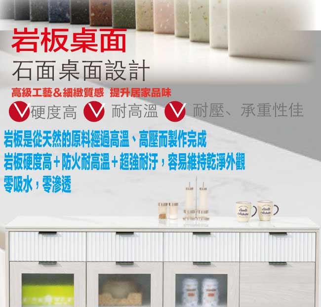 材質 | ◆產品名稱:【綠家居】剛果雙色5.3尺岩板六抽高餐櫃/收納櫃組合 尺寸:(寬)160x(深)40(高)201公分 ◆材質: 材質:防蛀木心板+防鏽黑漆五金腳座(12cm高)+五金滑軌結構+12mm高硬度岩板 噴漆:防潮亮面&耐磨噴漆處理