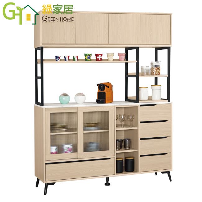 商 品 介 紹 | 【綠家居】蘭達5尺推&開門玻璃五抽高餐櫃組合 橡木紋色系+現代簡約風格+安心材質製造,整體採用防蛀木心板+烤漆金屬腳座+五金滑軌結構+5mm直紋強化玻璃+仿石面紋路桌面板(美耐皿材質)等安心材質製造,產品外層採用防潮耐磨噴漆處理搭配採用推門櫃(下櫃)+開門櫃(上櫃)+五抽屜+內&外開放層格等收納空間設計,全由專人配送到家,專業安心服務,替你省下更多時間! 【商品特色】 橡木紋色系+現代簡約風格+安心材質製造,使用放心+搭配居家更便利 採用防蛀木心板+烤漆金屬腳座+五金滑軌結構+5mm直紋強化玻璃+仿石面紋路桌面板(美耐皿材質)等安心材質製造 搭配採用推門櫃(下櫃)+開門櫃(上櫃)+五抽屜+內&外開放層格等收納空間設計 此商品不需要DIY組立,此商品為組立後之成品 品質保證、專業設計、貼心服務 全由專人配送到家,專業安心服務,替您省下更多時間