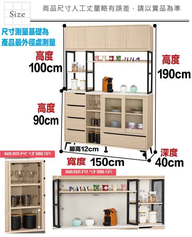 材質 | ◆產品名稱:【綠家居】蘭達5尺推&開門玻璃五抽高餐櫃組合 尺寸:(寬)150x(深)40(高)190/公分 ◆材質: 材質:防蛀木心板+烤漆金屬腳座+五金滑軌結構+5mm直紋強化玻璃+仿石面紋路桌面板(美耐皿材質) 表面防潮耐磨噴漆處理 |