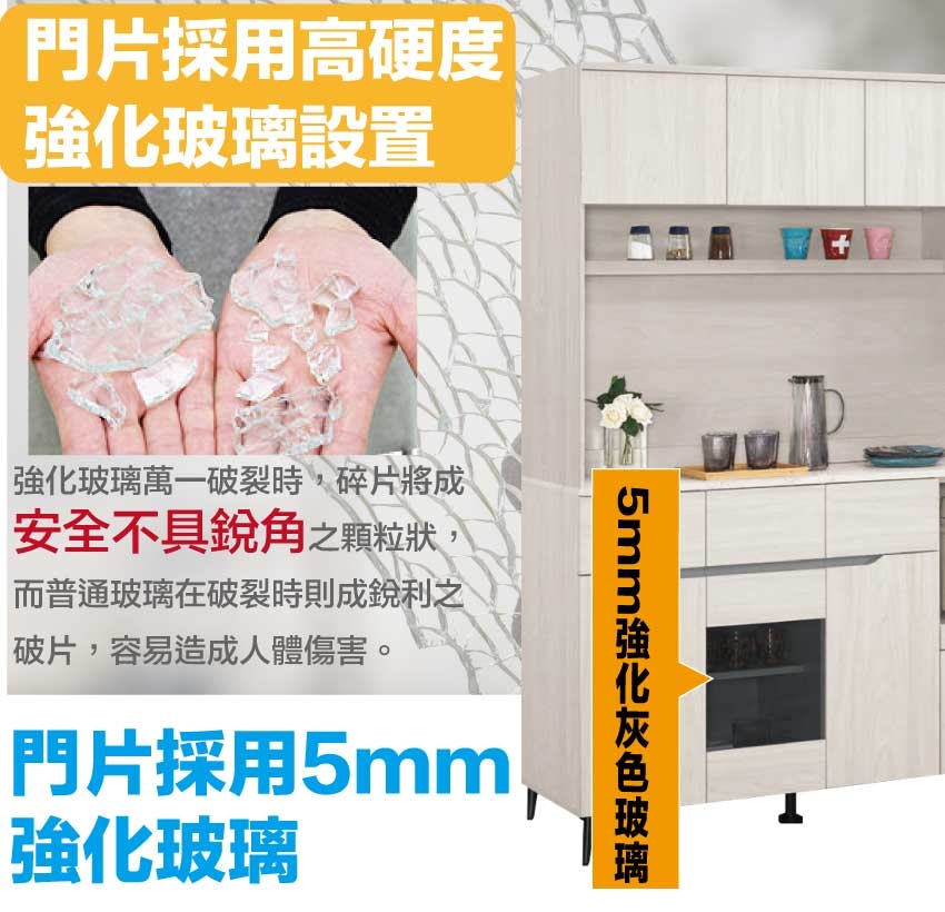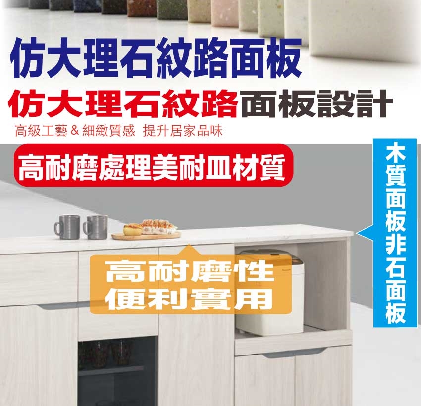 材質:防蛀木心板+烤漆五金腳座+防夾手緩衝門片五金+5mm強化灰玻璃+仿石紋耐磨美耐皿桌面板+五金滑軌結構