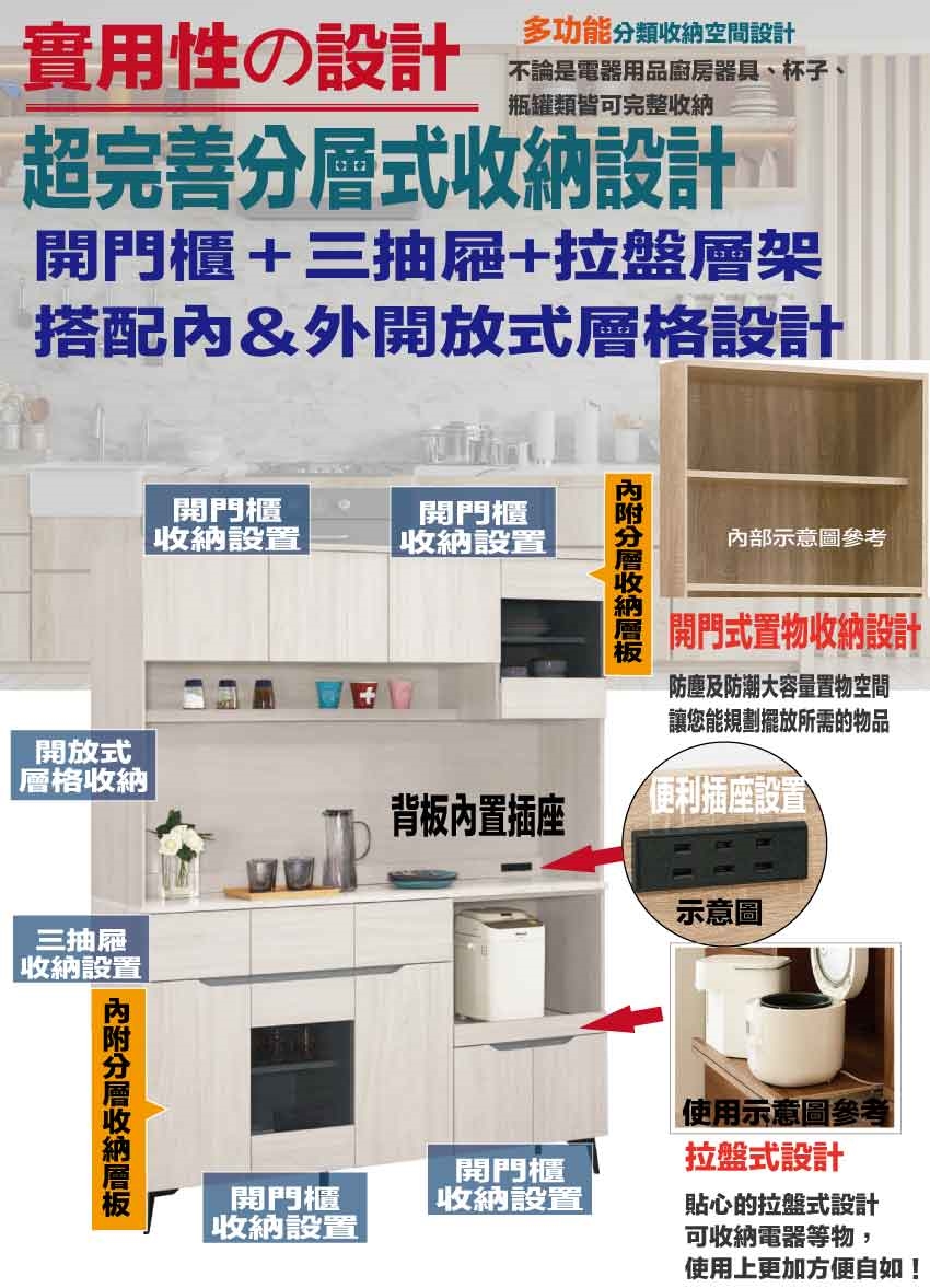 搭配採用開門櫃+拉盤層架+三抽屜+內&外開放層格+便利插座等收納空間設計