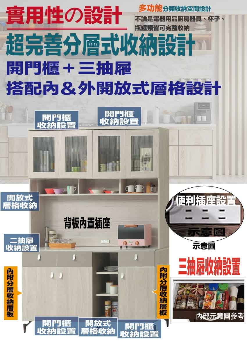 搭配採用開門櫃+三抽屜+內&外開放層格等收納空間設計