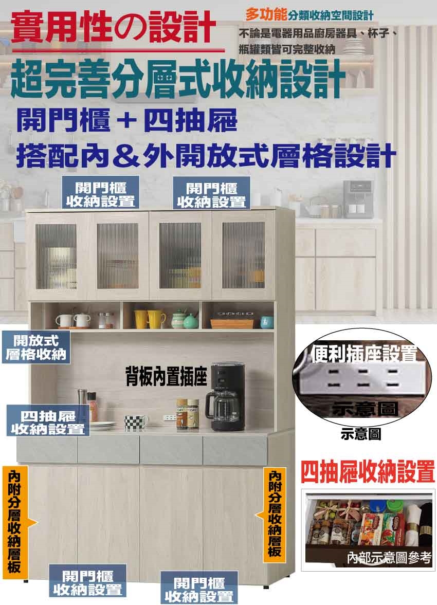 搭配採用開門櫃+四抽屜+內&外開放層格等收納空間設計