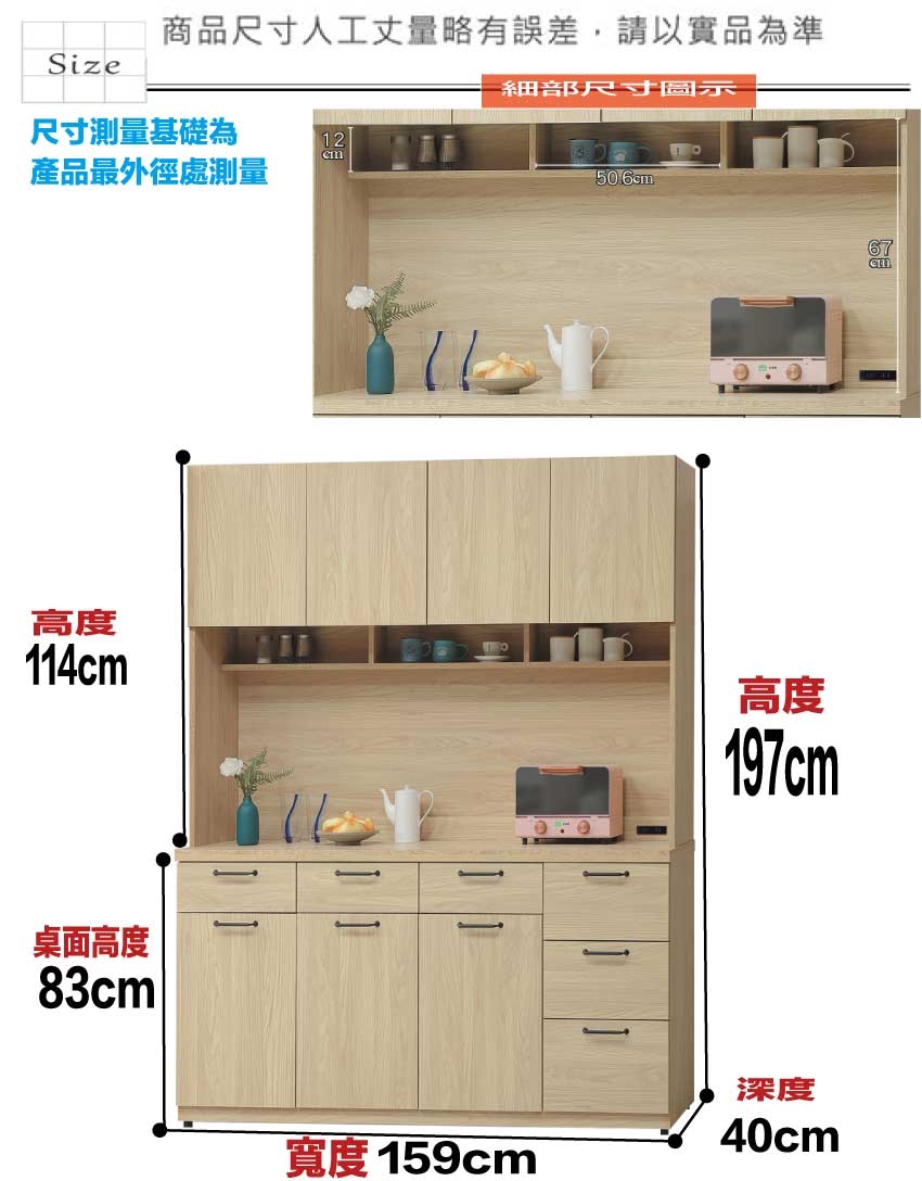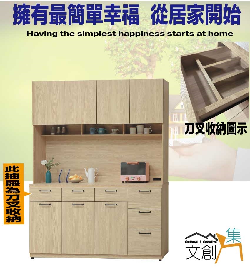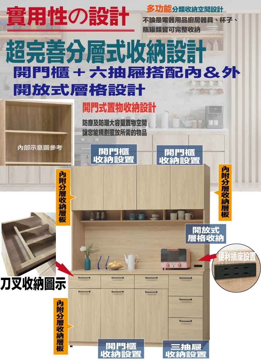 搭配採用開門櫃+六抽屜(含刀叉收納抽)+內&外開放層格等收納空間設計