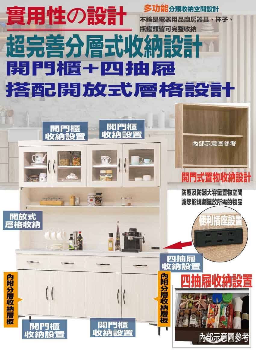 搭配採用開門櫃+四抽屜+內&外開放層格等收納空間設計