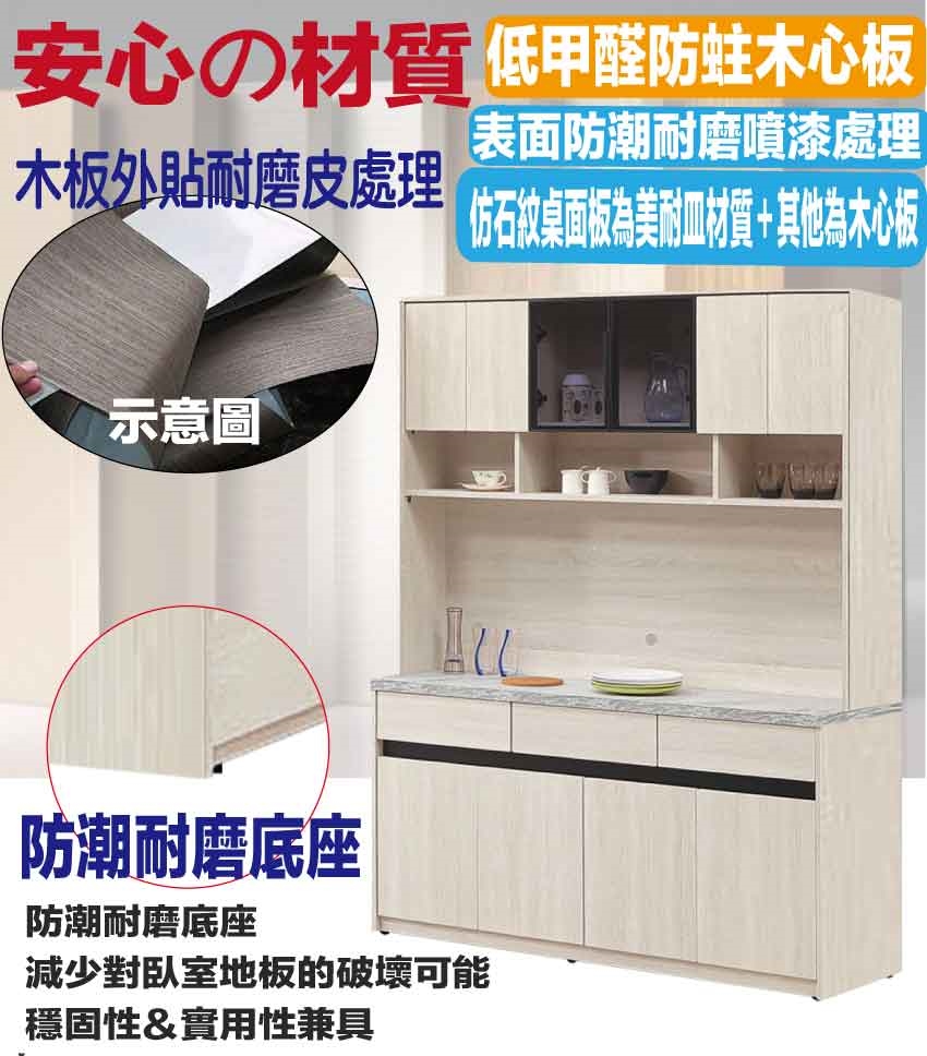 防蛀木心板+防潮耐磨腳座+防夾手緩衝五金+五金滑軌結構+耐磨美耐皿仿大理石紋桌面板+黑色鋁製框架+強化玻璃門片等材質製造