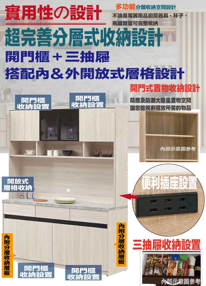 採用開門櫃+三抽屜+內&外開放層格等收納空間設計