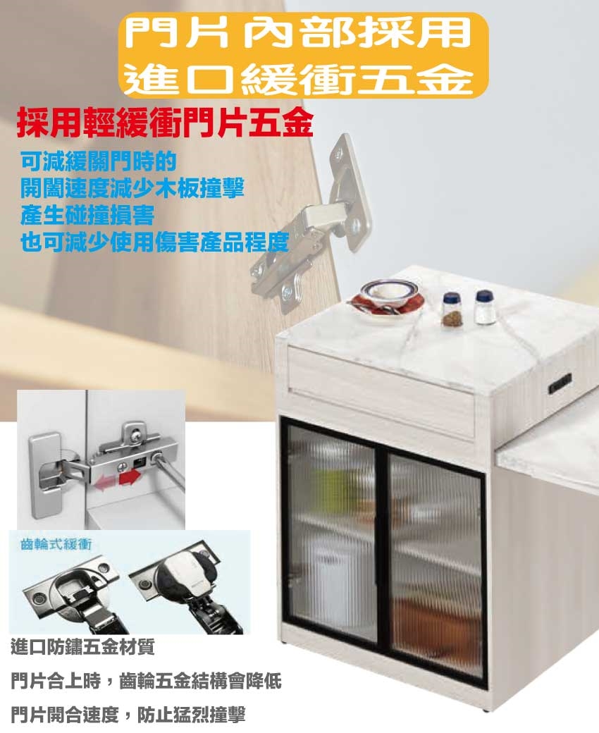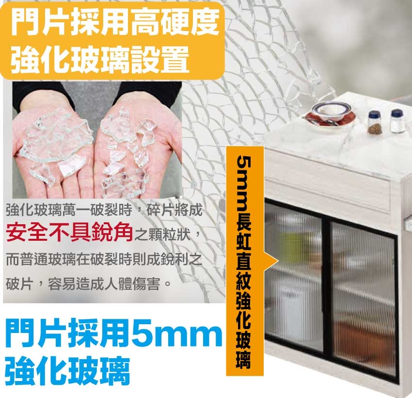 材質:防蛀木心板+防潮耐磨腳座+防夾手緩衝門片五金+仿石紋耐磨美耐皿桌面板+5mm強化直紋玻璃+五金滑軌結構