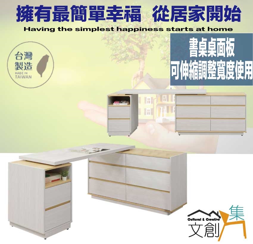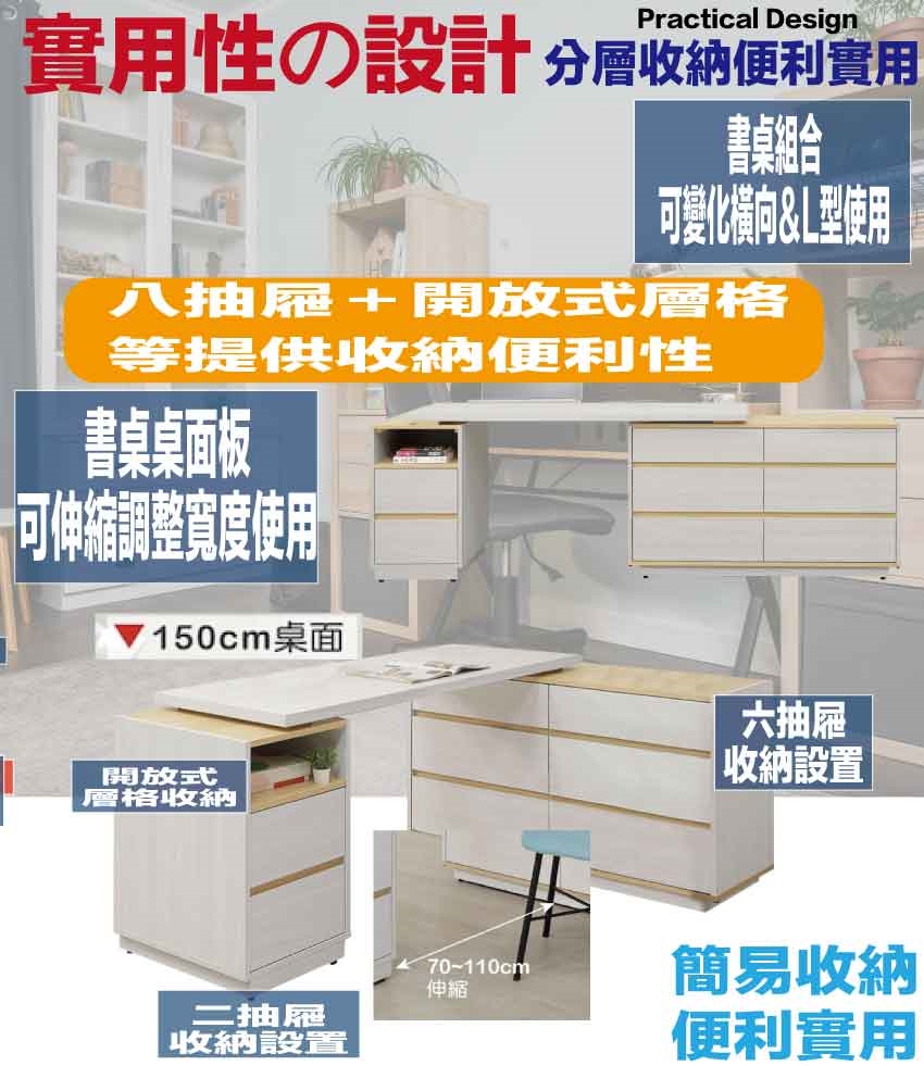 搭配採用八抽屜+可伸縮桌面板+開放層格等收納空間設計