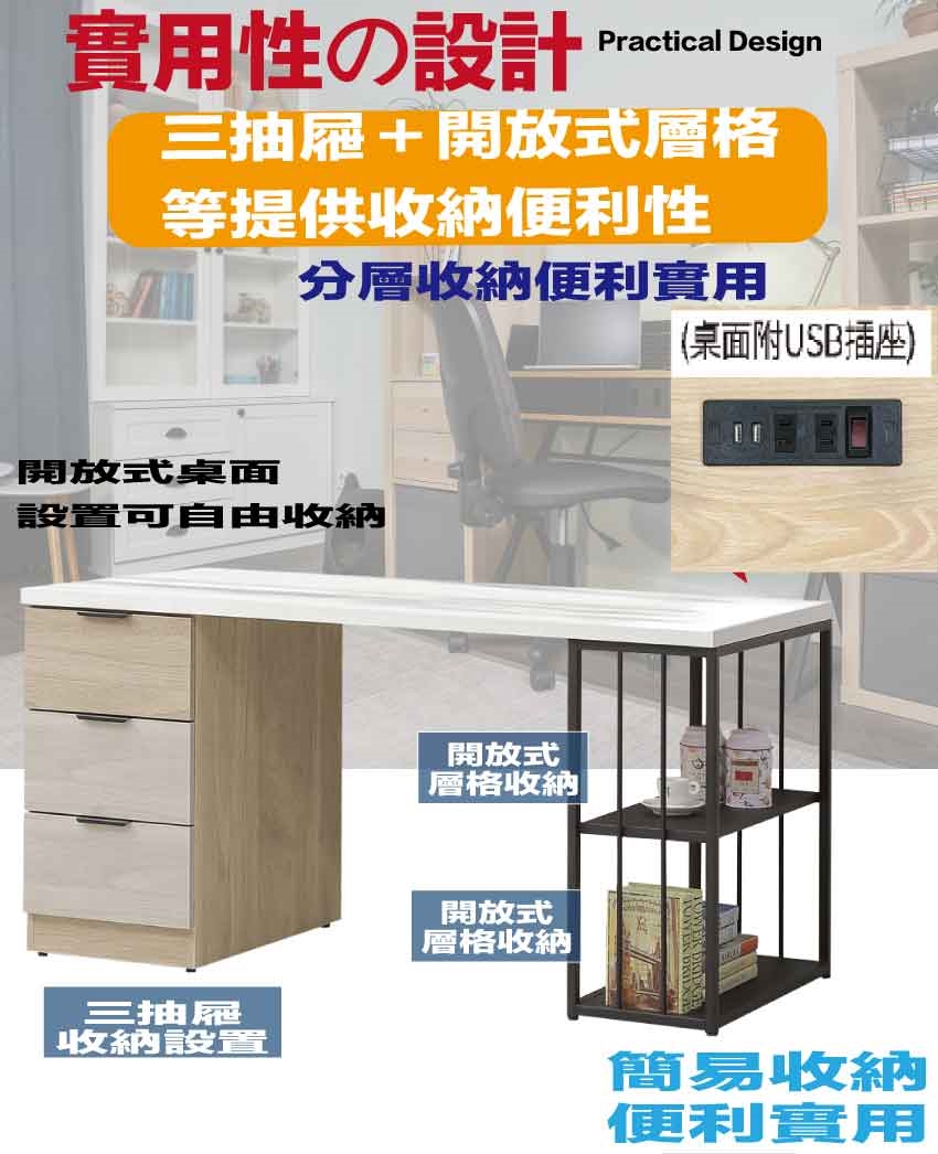 搭配採用三抽屜+開放層格+附插座單個等收納空間設計