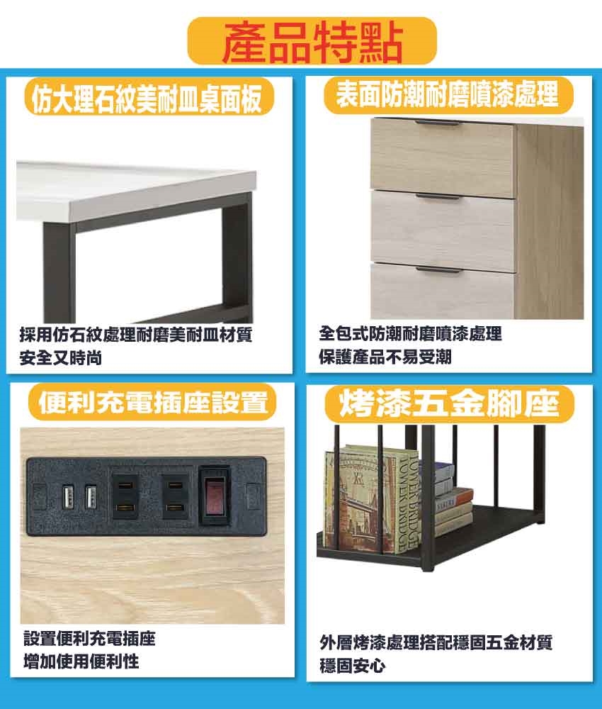 採用防蛀木心板+防潮耐磨底座+烤漆五金腳座+五金滑軌結構+仿大理石紋耐磨美耐皿材質桌面板等安心材質製造