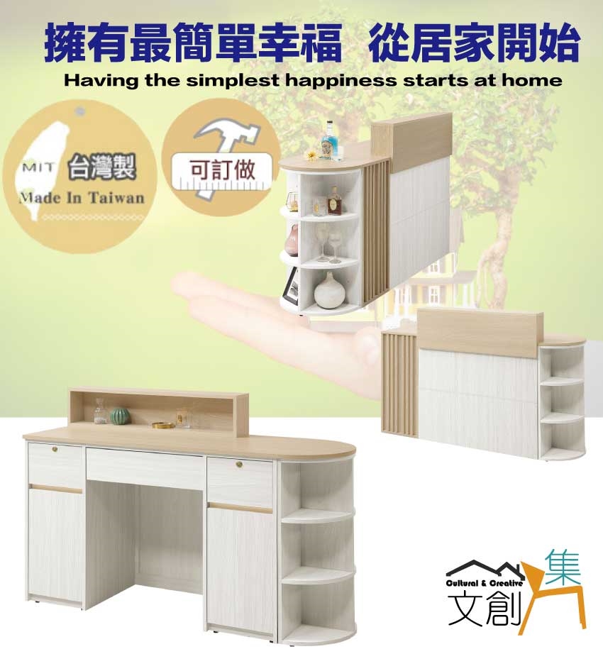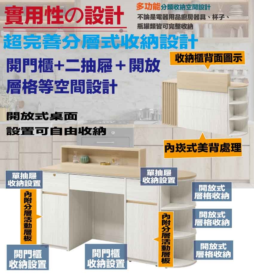 搭配採用開門櫃+三抽屜+內&外開放層格等收納空間設計