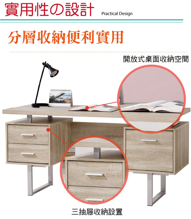 三抽屜+開放式桌面等收納設計,輕鬆不費力,讓您家中不凌亂