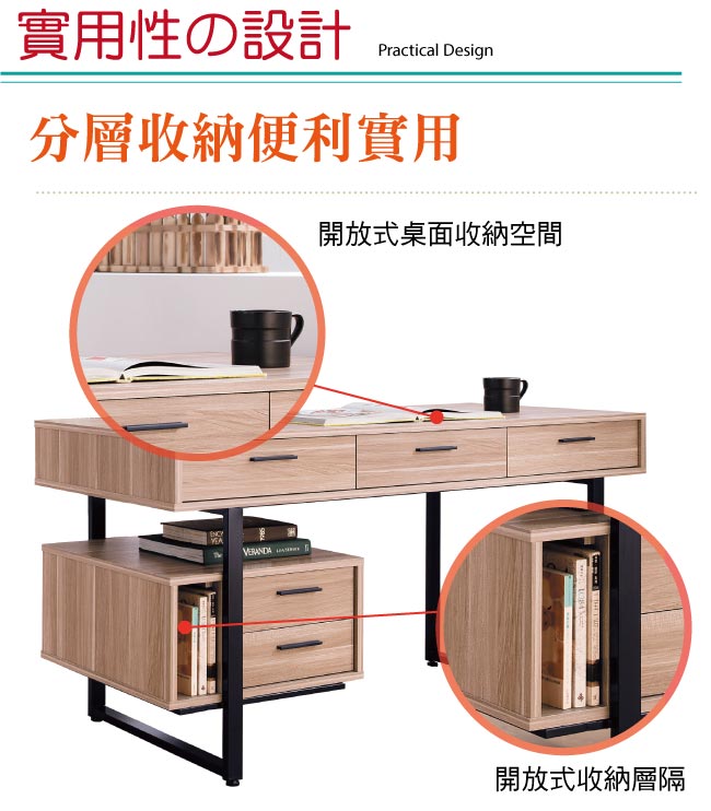 五抽屜+開放式桌面等收納空間設計,讓您好收納,保持空間整齊乾淨不再是夢想