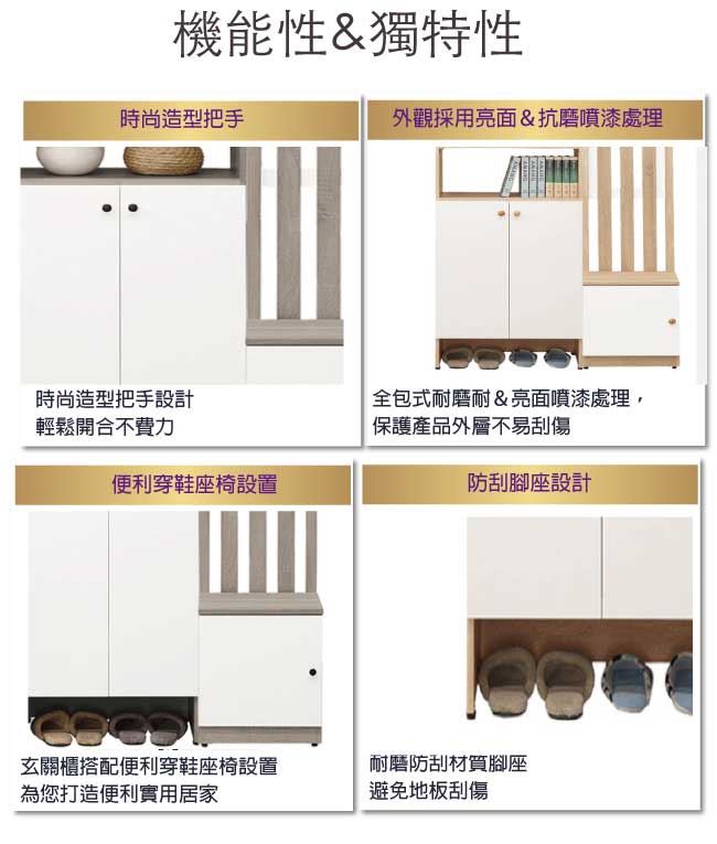 商品 介紹 | 【綠家居】奧蘿瑟 時尚3.4尺多功能玄關櫃/高鞋櫃(二色可選) 二色可選+現代簡約風格+安心材質製造,整體採用防蛀木心板+防潮耐磨腳座+防夾手緩衝門片五金等安心材質製造,產品外層採用防潮耐磨&亮面噴漆處理搭配搭配採用開門櫃+座鞋椅凳設置+內&外開放式收納層格等收納空間設計,全由專人配送到家,專業安心服務,替你省下更多時間! 【商品特色】 二色可選+現代簡約風格+安心材質製造,使用放心+搭配居家更便利 採用防蛀木心板+防潮耐磨腳座+防夾手緩衝門片五金等安心材質製造 產品外層採用防潮耐磨&亮面噴漆處理 搭配採用開門櫃+座鞋椅凳設置+內&外開放式收納層格等收納空間設計 此商品不需要DIY組立,此商品為組立後之成品 品質保證、專業設計、貼心服務 全由專人配送到家,專業安心服務,替您省下更多時間 |