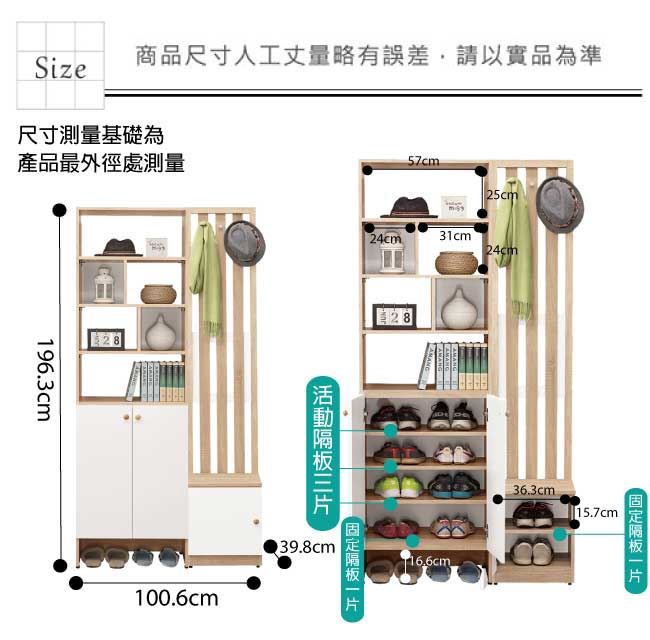 材質 | ◆產品名稱: 【綠家居】奧蘿瑟 時尚3.4尺多功能玄關櫃/高鞋櫃(二色可選) 尺寸:(寬)100.6x(深)39.8x(高)196.3/公分 ◆材質: 材質:防蛀木心板+防潮耐磨腳座+防夾手緩衝門片五金+五金滑軌結構 噴漆:防潮耐磨&亮面噴漆處理