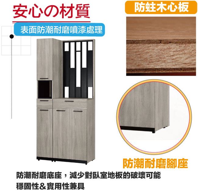 材質 | ◆產品名稱:【綠家居】卡瑞3尺四門二抽高玄關屏風鞋櫃組合 尺寸:(寬)90x(深)38(高)197公分 ◆材質: 材質:防蛀木心板+防潮耐磨腳座+防夾手緩衝門片五金+五金滑軌結構 噴漆:防潮耐磨噴漆處理