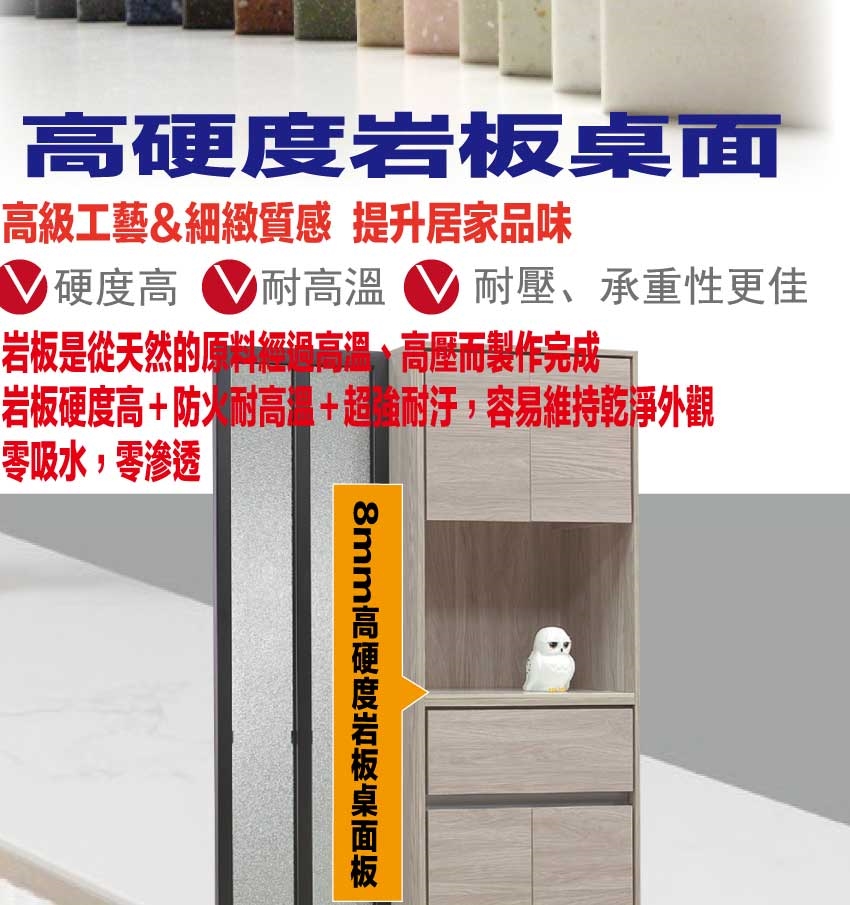 採用防蛀木心板+防夾手緩衝門片五金+防潮耐磨底座+五金滑軌結構+12mm高硬度岩板桌面板等安心材質製造