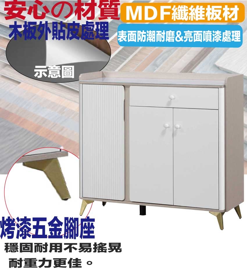 材質:防潮MDF板+烤漆金屬腳座+防夾手緩衝門片五金+3mm仿大理石紋強化玻璃頂板