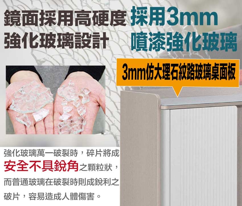 採用防潮MDF板+烤漆金屬腳座+防夾手緩衝門片五金+3mm仿大理石紋強化玻璃頂板等安心材質製造