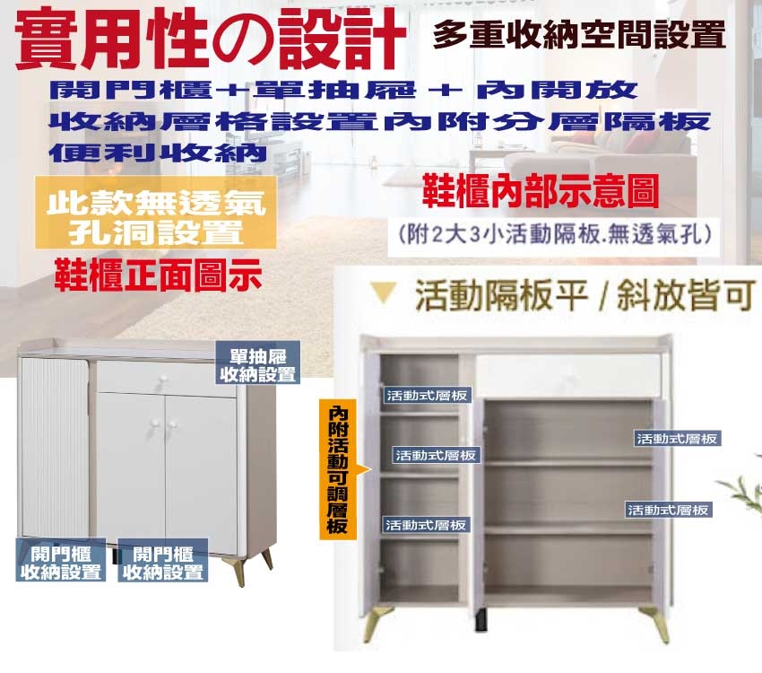 搭配採用開門櫃+單抽屜+內開放多層格等收納空間設計