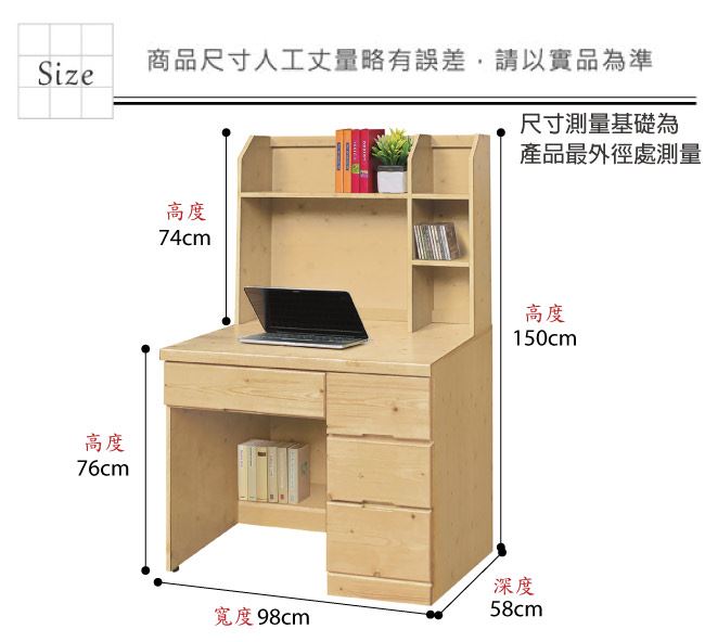 材質 | ◆產品名稱:【綠家居】沛可3.3尺實木四抽高書桌組合 尺寸:(寬)98x(深)58(高)150/公分 請注意:使用松木實木產品上有些許木結紋路為自然現象,介意者請購買前多考慮!謝謝 ◆材質: 材質:松木實木+防蛀木心板+防潮耐磨腳座+五金滑軌結構 噴漆:防潮耐磨噴漆處理