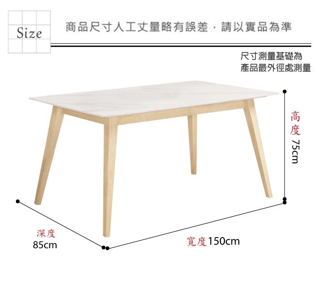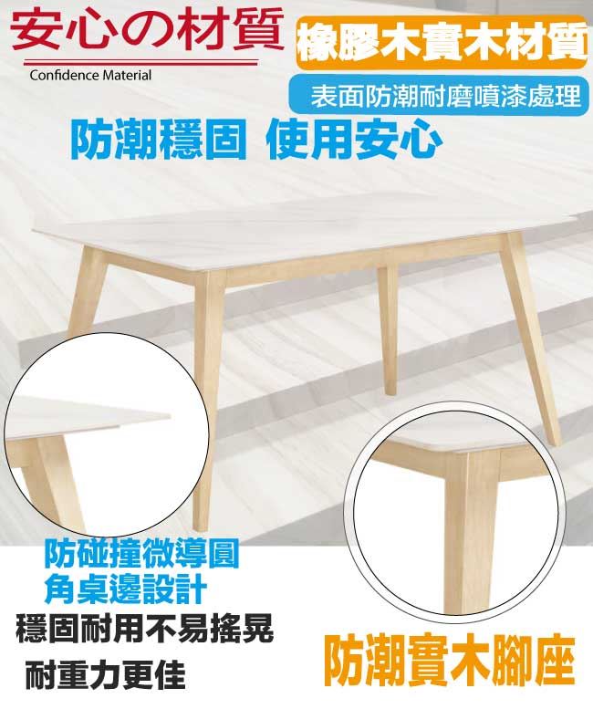 材質 | ◆產品名稱:【綠家居】達里卡5尺岩板實木餐桌布餐椅組合(一桌四椅組合) 餐桌尺寸:(寬)150x(深)85x(高)75/公分 餐椅尺寸:(寬)48x(深)61x(高)83/公分 ◆材質: 材質:橡膠木實木+防潮實木腳座+12mm高硬度岩板桌面板+鐵製椅身底框+防潮鐵製外貼木紋皮腳座+透氣棉麻布+高回彈海綿+外層防潮耐磨噴漆處理
