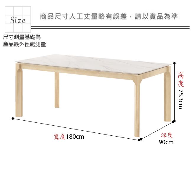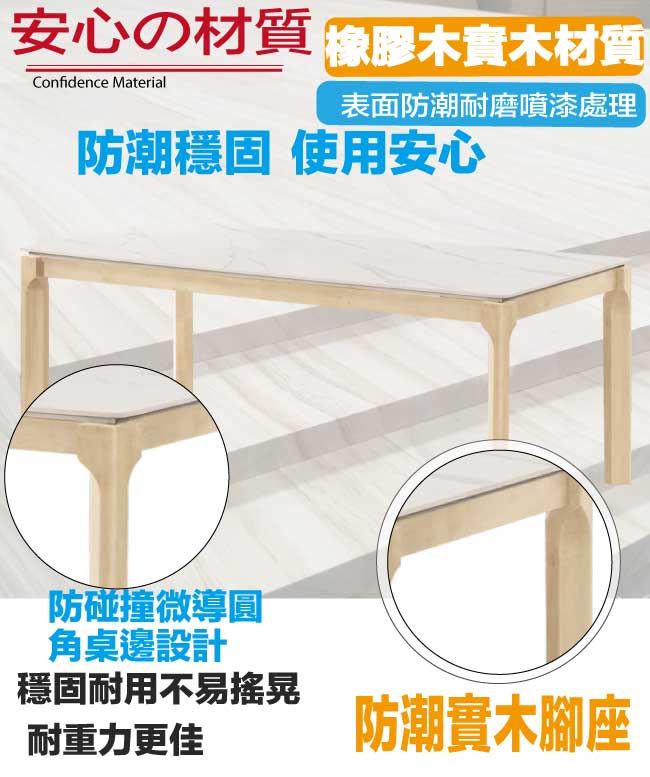 材質 | ◆產品名稱:【綠家居】克萊莉6尺岩板實木餐桌布餐椅組合(一桌六椅組合) 餐桌尺寸:(寬)180x(深)90x(高)75.3/公分 餐椅尺寸:(寬)54x(深)57.5x(高)72.5/公分 ◆材質: 材質:橡膠木實木+防潮實木腳座+12mm高硬度岩板桌面板+橡膠木實木外貼實木皮處理+透氣棉麻布+高回彈海綿+外層防潮耐磨噴漆處理